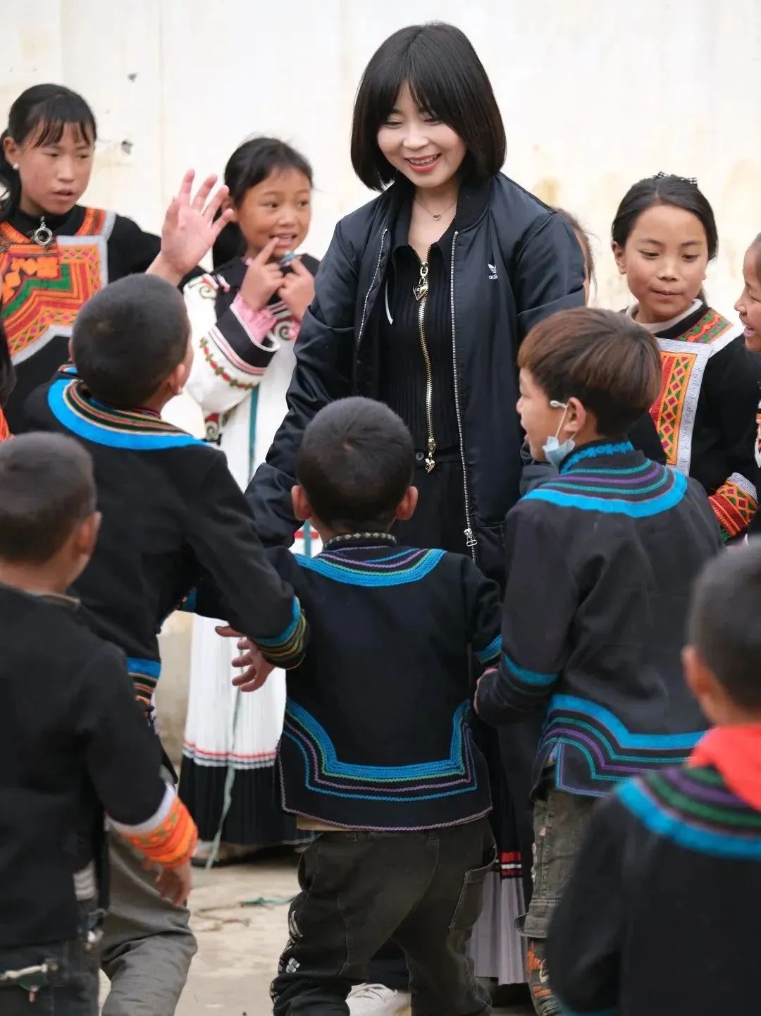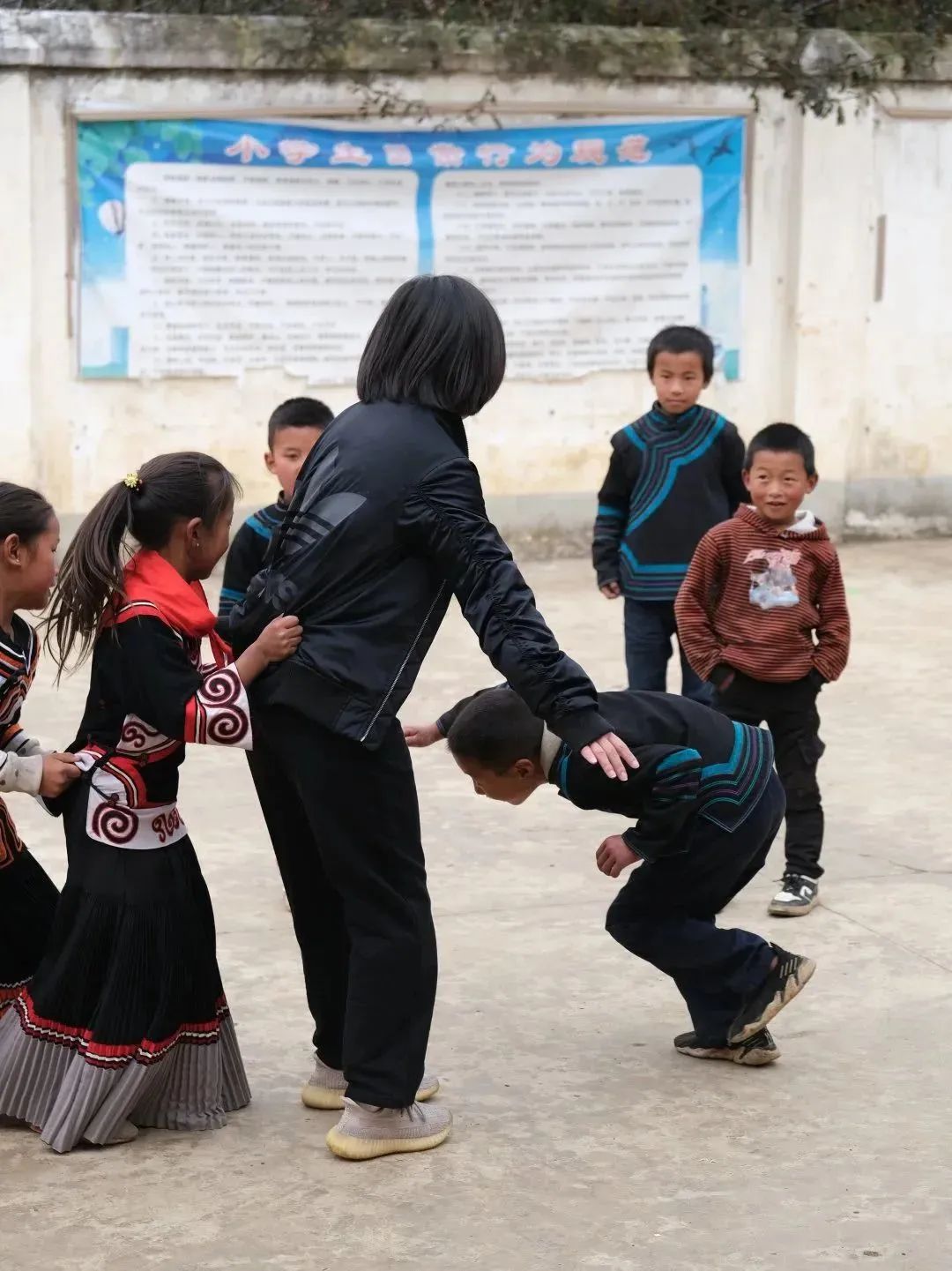 公益委的小伙伴們在小朋友的“教學(xué)”下還體驗(yàn)了當(dāng)?shù)貍鹘y(tǒng)舞蹈,一起玩丟手絹、老鷹捉小雞等游戲。在玩游戲的過程中,小朋友們反復(fù)唱著:“聽我說,謝謝你,因?yàn)橛心悖瑴嘏怂募荆恢x謝你,感謝有你,世界更美麗;我要謝謝你,因?yàn)橛心悖瑦鄢T谛牡祝恢x謝你,感謝有你,把幸福傳遞……”公益委的小伙伴們被小朋友們的真摯、純樸和簡單的快樂深深打動。