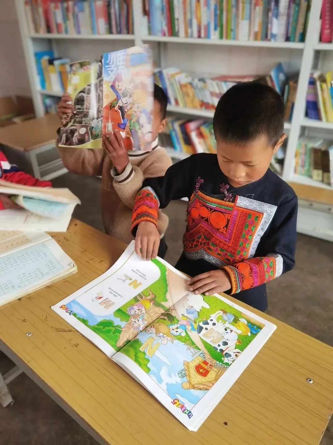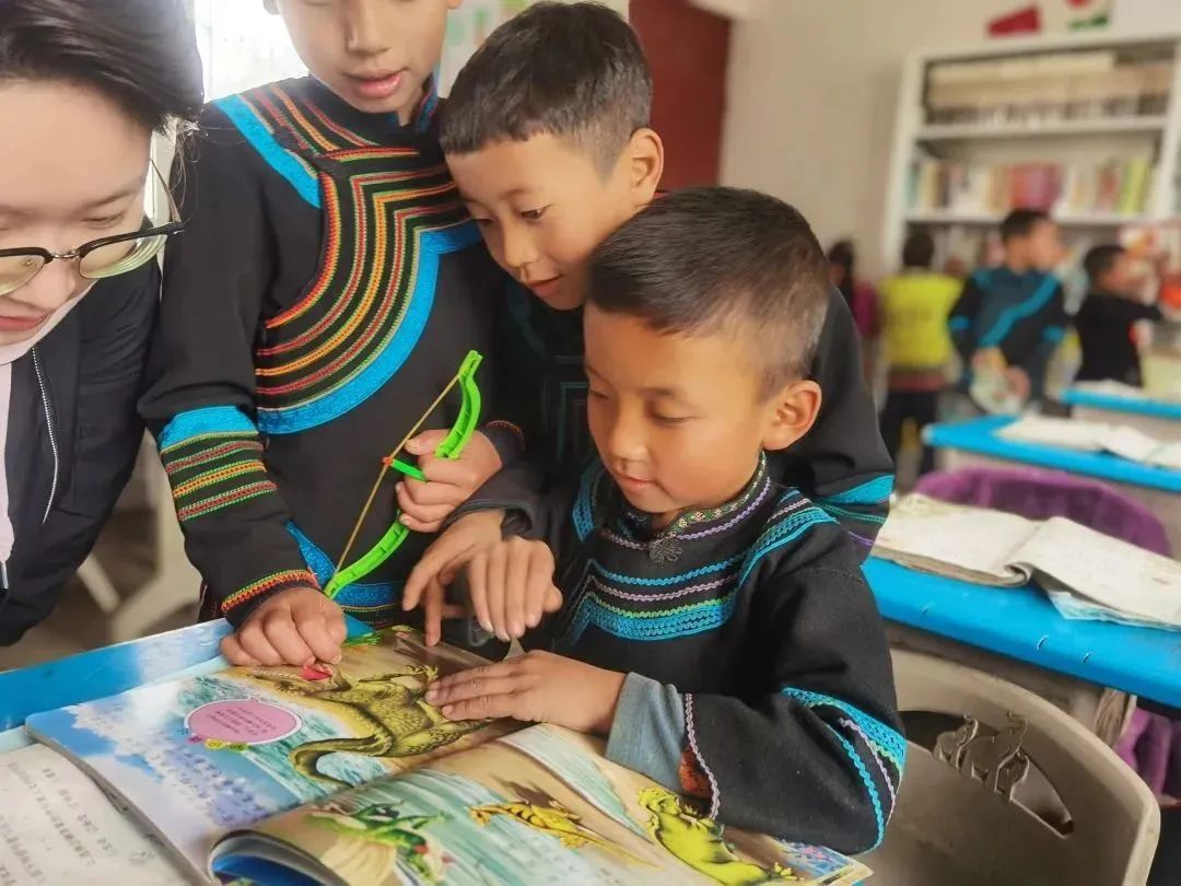 盡管舟車勞頓,公益委的小伙伴們第二天都精神抖擻,早早來到學(xué)校開展工作。公益委副主任鄭立秋與學(xué)校的校長、阿各老師完成了國浩圖書角的授牌以及近4000冊圖書清單的交接儀式。她說:“希望小朋友們可以借助這些書,在有限的空間里看到無限的世界。”儀式后,大家一起把35箱書開封上架,小朋友們也紛紛擠過來,在一旁有序地幫著分類、傳遞書本。