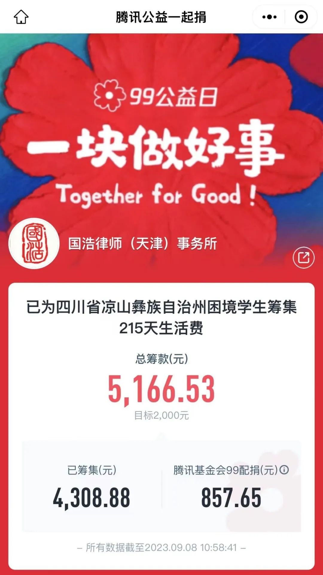 國浩天津自2020年成為四川省索瑪慈善基金會愛心理事會員單位后,每年對大涼山困境學生及希望小學進行不同形式的資助及物資捐贈。9月9日,國浩天津聯合四川省索瑪慈善基金會,共同發起“為大涼山困境學生捐助100天生活費2000元”募捐活動。活動開始短短一小時,國浩天津的愛心捐款就已超過四千余元,加上配捐金額一小時共計募捐善款5,166.53元,遠遠超過計劃目標,此筆善款將使更多大涼山學生的生活得到改善。