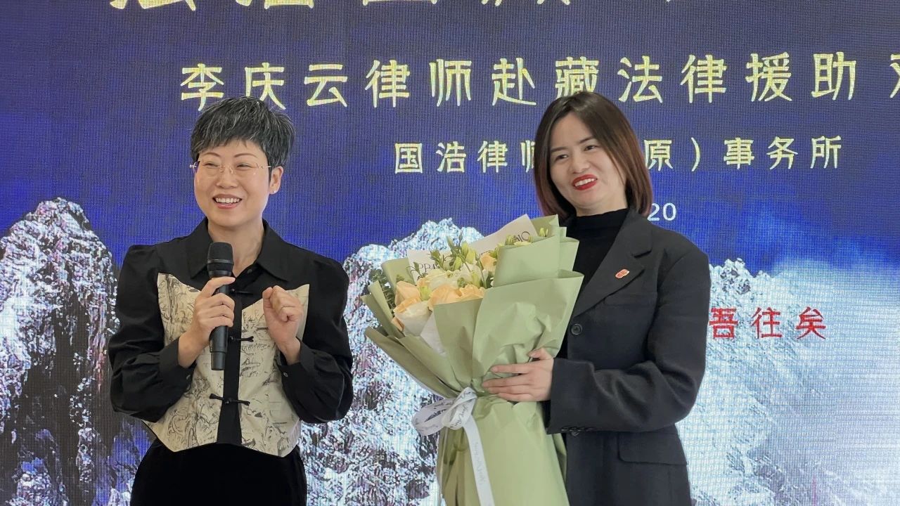 最后,國浩太原管理合伙人、主任張蕾代表國浩太原為李慶云律師送上花束與祝福。張蕾主任表示,史莉律師的援藏行為在國浩太原內(nèi)樹立了榜樣,起到了很好的帶動作用,此次李慶云律師援藏是接力,更是傳承。律師援藏絕不僅僅是一種情懷,更是一種責任和擔當,國浩太原一直以社會責任為己任,將大力支持西藏法律服務(wù)體系建設(shè),全方位做好支持工作,確保李慶云律師在拉孜的援藏工作中沒有后顧之憂,期待她凱旋歸來。