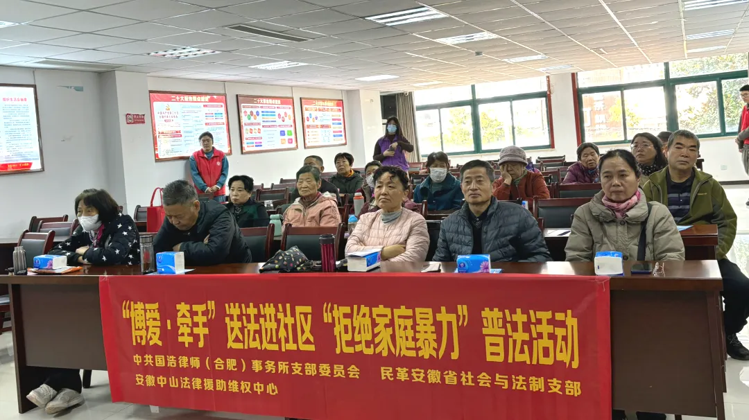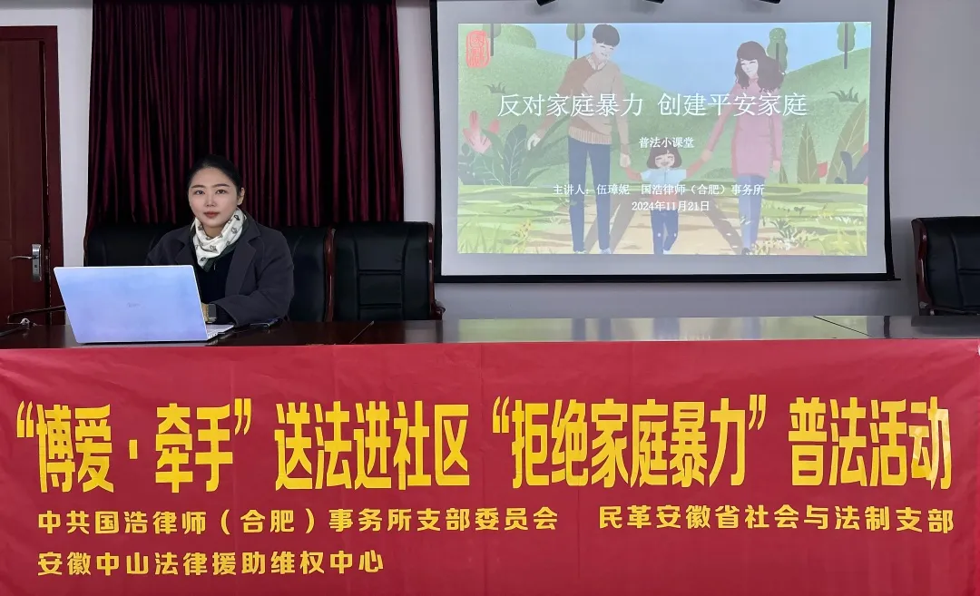 在“國際消除家庭暴力日”來臨之際,為有效預(yù)防和制止家庭暴力,保護家庭成員的合法權(quán)益,促進家庭和諧、社會穩(wěn)定,11月21日上午,國浩合肥黨支部聯(lián)合安徽中山法律援助維權(quán)中心(以下簡稱“中山法援”)走進合肥市蜀山區(qū)丁崗社區(qū)黨群服務(wù)中心開展反家暴普法活動。國浩合肥律師伍璋妮,中山法援工作人員、國浩合肥行政人員李鑫為社區(qū)居民帶來“拒絕家庭暴力”專題普法講座。