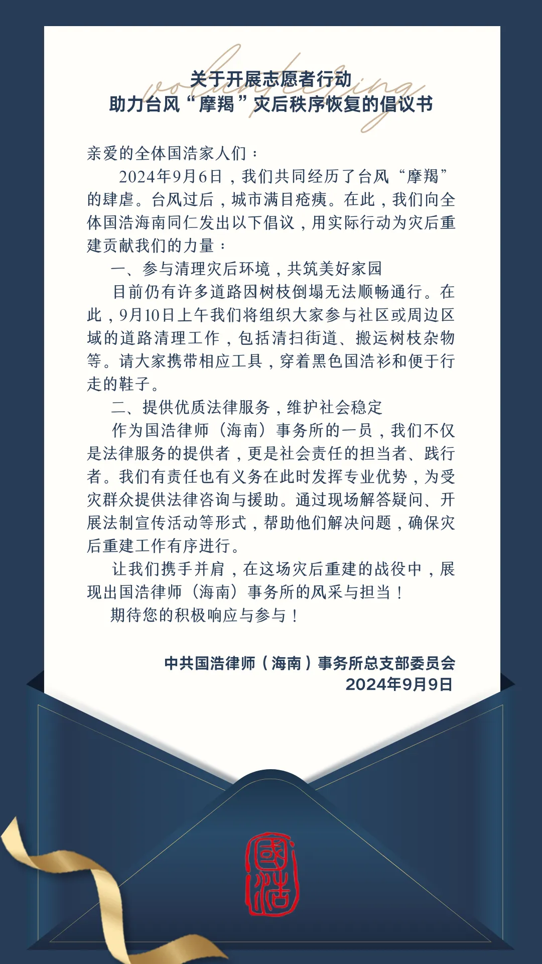 臺風“摩羯”給海南帶來了巨大的災難,但我們堅信,只要懷揣“迎萬難”的決心,付出“抵萬難”的行動,必將收獲“贏萬難”的生機和未來!接下來,國浩海南將一如既往踐行社會責任,積極投身公益事業(yè),全力以赴為災后重建貢獻國浩力量!