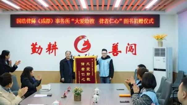 國浩執行合伙人、國浩成都管理合伙人、主任劉小進為“國浩圖書角”授牌,龍吉才校長代表學校及全體教職工和學生接受授牌,并贈送錦旗以表達對國浩律師熱衷公益、心系教育的由衷感謝。