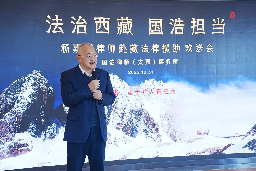 歡送會伊始,國浩太原黨支部書記、合伙人王超群發表致辭。他在發言中提及,楊嘉琪律師是國浩太原繼第三批國浩駐藏律師史莉、第四批國浩駐藏律師李慶云后第三位主動報名、踴躍參與援藏工作的青年律師,這份勇氣與擔當值得全體同仁學習。他強調,此次楊嘉琪律師援藏不僅是國浩太原對國浩公益援藏計劃的積極響應,更是國浩太原人踐行社會責任、彰顯擔當的具體體現。王超群書記鼓勵楊嘉琪律師在藏期間,要始終保持政治堅定,充分發揮黨員先鋒模范作用,快速適應西藏特殊的法治環境與社會背景,盡快融入當地工作與生活。將國浩太原專業的法律業務能力帶到西藏拉孜,做好援藏工作。國浩太原永遠是最堅強的后盾,無論在藏期間遇到案件協作、文件處理等工作難題,還是生活上的需求,國浩太原都會第一時間提供全方位支持,確保楊嘉琪律師能無后顧之憂,安心投入援藏工作。