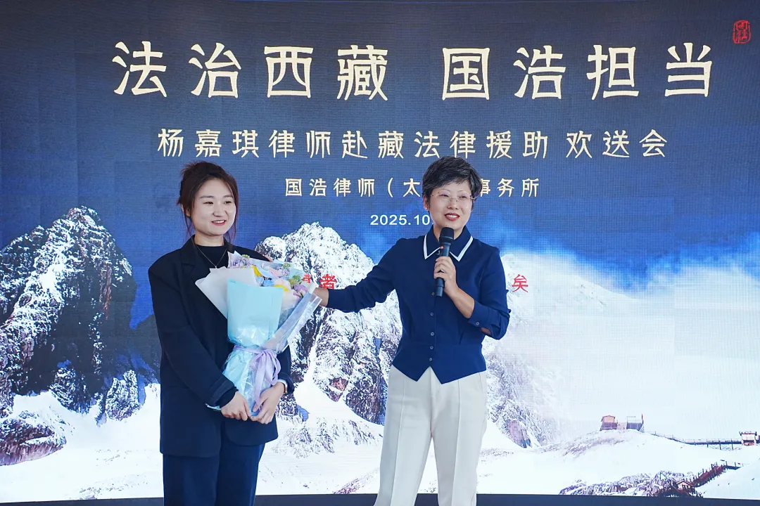 歡送會接近尾聲時,國浩太原管理合伙人、主任張蕾代表國浩太原,向楊嘉琪律師送上了寓意美好與祝福的花束。張蕾主任感慨道,這已經是國浩太原第三次為援藏同事舉辦歡送會,每當看到年輕律師主動奔赴西藏支援,心中既為他們的擔當感到驕傲,又滿是牽掛。她叮囑楊嘉琪律師,西藏高原環境特殊,一定要時刻關注自己的身體健康,警惕高原反應等可能帶來的不適,務必保護好自己。張蕾主任還介紹了國浩太原參與國浩公益援藏工作的相關情況并強調,國浩太原的每一位援藏律師,不僅承載著國浩太原的擔當、國浩律師的擔當,更肩負著對國家法治建設的責任。目前西藏部分地區的法治資源相對匱乏,仍有十幾個縣市沒有專業律師,正是這樣的現狀,讓援藏工作無論是對參與其中的個人,還是對整個律所而言,都有著非凡的意義。最后,張蕾主任再次祝愿楊嘉琪律師能不辱使命,順利完成此次援藏任務,平安、圓滿地歸來。