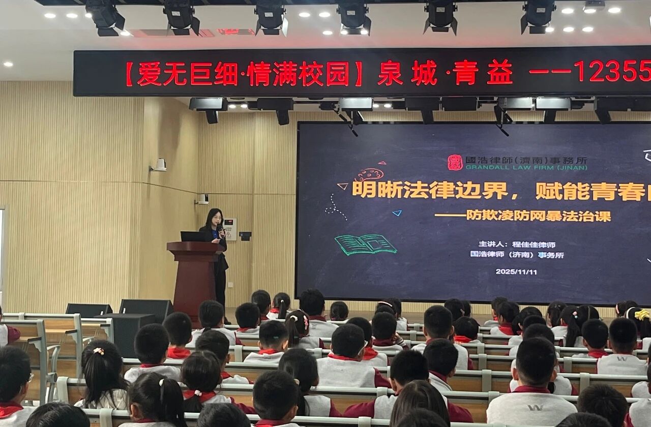 國浩濟南公益委員會副主任、律師程佳佳以“明晰法律邊界,賦能青春自護——防欺凌防網(wǎng)暴法治課”為主題,為該小學(xué)三年級學(xué)生帶來了一堂生動實用的普法教育課,助力孩子們在法治陽光下健康成長。