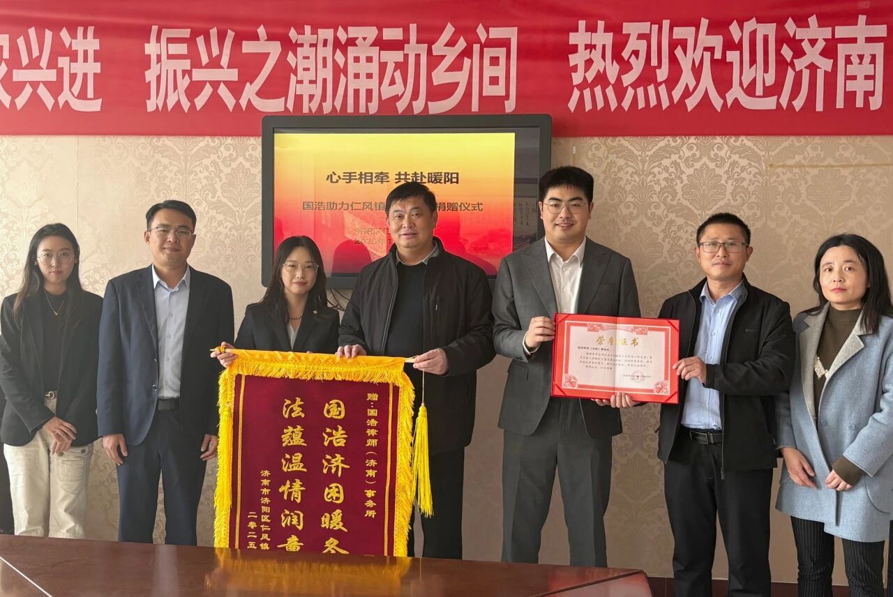 捐贈(zèng)活動(dòng)伊始,仁風(fēng)鎮(zhèn)中學(xué)特別舉辦了溫馨的接收儀式,并向國(guó)浩濟(jì)南表達(dá)誠(chéng)摯謝意。國(guó)浩濟(jì)南公益委員會(huì)副主任、律師程佳佳,國(guó)浩濟(jì)南公益委員會(huì)委員、律師趙東瑞、劉振、宋昱羽,仁風(fēng)鎮(zhèn)中學(xué)黨支部書(shū)記郭興春、副書(shū)記孫傳信、辦公室主任高嵩共同出席。