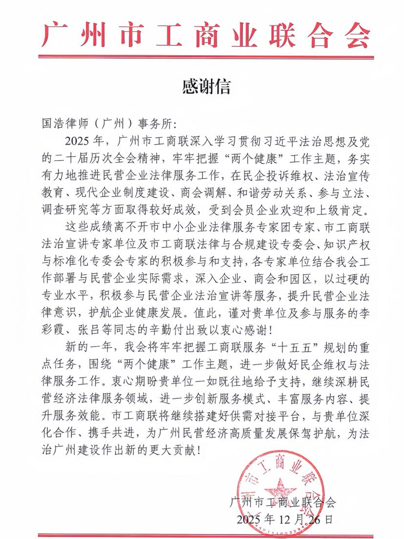 近日,國浩廣州收到來自廣州市工商業聯合會(以下簡稱“廣州市工商聯”)的感謝信,信中對國浩廣州作為其法治宣講專家單位的履職成效予以高度認可,并特別向國浩粵港澳大灣區業務發展中心執行主任、國浩廣州管理合伙人張呂,國浩廣州合伙人李彩霞等服務團隊成員的辛勤付出致以誠摯感謝。