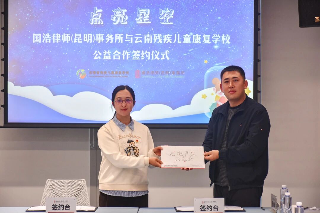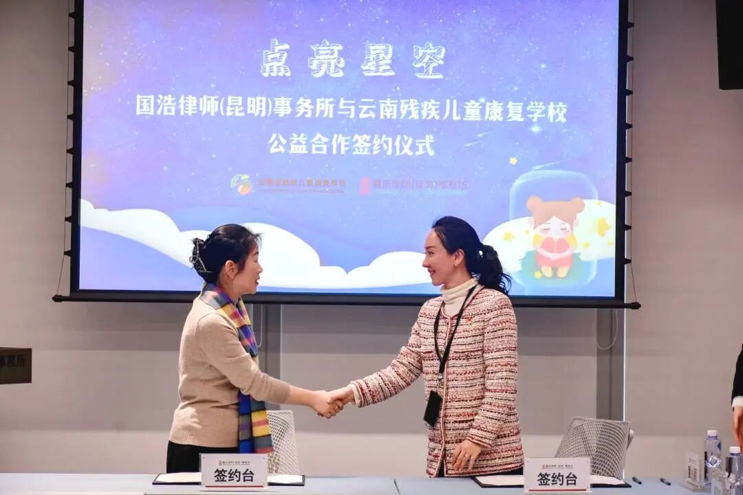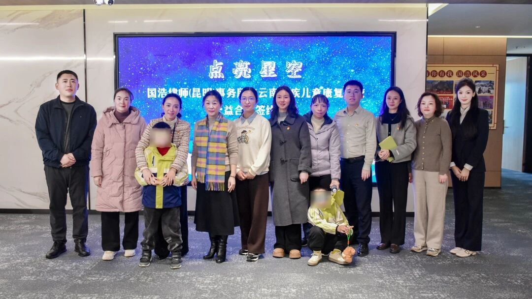 2026年1月12日,國浩律師(昆明)事務所與云南省殘疾兒童康復學校(以下簡稱“兒康?!保┱胶炇稹包c亮星空”公益合作協議,兒康校孤獨癥兒童家長代表到場見證。簽約儀式的舉行,標志著國浩昆明將攜手校方,為云南困難家庭的特殊兒童提供可持續的成長支持。