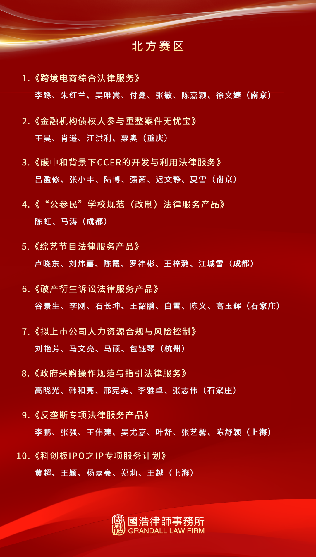 本次大賽由國(guó)浩律師事務(wù)所主辦,國(guó)浩發(fā)展研究院、國(guó)浩青年律師工作委員會(huì)共同承辦,同時(shí)國(guó)浩昆明辦公室和國(guó)浩石家莊辦公室傾力支持并分別承辦了南方賽區(qū)和北方賽區(qū)復(fù)賽。歷經(jīng)初賽篩選,結(jié)合專業(yè)律師評(píng)委的打分評(píng)選,有38個(gè)法律服務(wù)產(chǎn)品從66個(gè)產(chǎn)品中“沖出重圍”進(jìn)入復(fù)賽,爭(zhēng)奪決賽名額(點(diǎn)擊“閱讀原文”查看全部復(fù)賽參賽名單)。來(lái)自國(guó)浩18個(gè)辦公室的164名律師經(jīng)過(guò)兩日激烈的競(jìng)爭(zhēng)角逐,最終有19個(gè)產(chǎn)品強(qiáng)勢(shì)突圍晉級(jí)決賽!