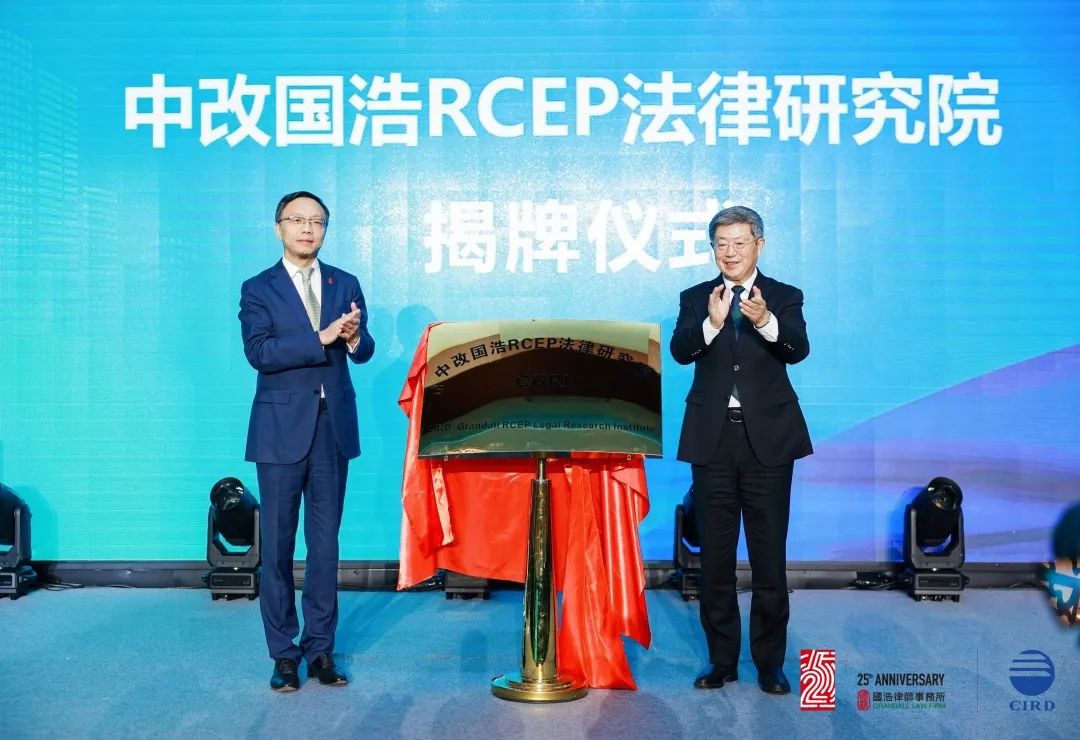 潮平岸闊催人進(jìn),風(fēng)正揚(yáng)帆起航時(shí)。論壇上,中改國(guó)浩RCEP法律研究院(CIRD-Grandall RCEP Legal Research Institute,簡(jiǎn)稱CGRI)揭牌儀式成功舉行。國(guó)浩律師事務(wù)所首席執(zhí)行合伙人呂紅兵遲福林院長(zhǎng)共同揭牌。