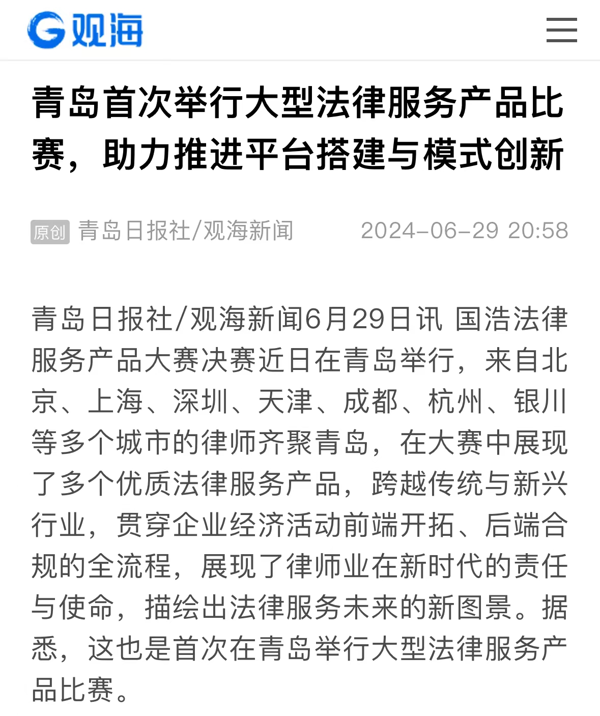 這是青島首次舉行大型法律服務產品比賽,青島廣播電視臺和青島日報/觀海新聞等媒體也對本次大賽盛況進行了報道。
