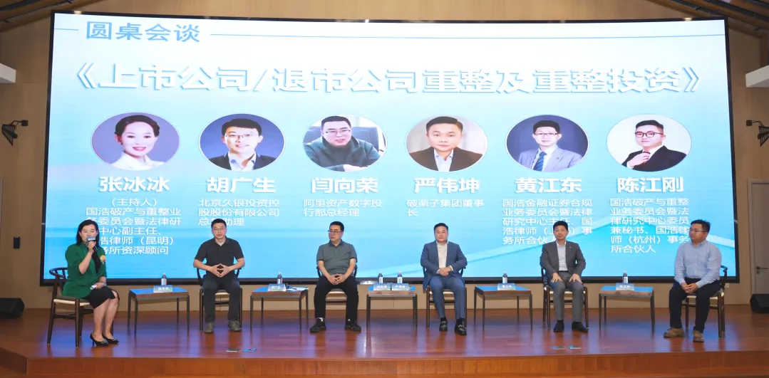 第一場圓桌會談由國浩破產與重整業務委員會副主任、國浩昆明資深顧問張冰冰擔任主持人。北京久銀投資控股股份有限公司總裁助理胡廣生指出當前上市公司重整投資領域競爭加劇,篩選投資標的時應遵守“三低兩高一核心”的邏輯,以期與產業投資人進行深度綁定;阿里資產數字投行部總經理閆向榮表示,上市公司的破產重組是資本市場最為熱門的話題之一,阿里資產專門設立數字投行部,通過大數據、人工智能為投資人決策、上市公司業態選擇、重整方案設計等提供支持;破栗子集團董事長嚴偉坤立足于平臺公司的視角,對數據和科技如何賦能上市公司破產重組的各個環節進行解讀;國浩金融證券合規業務委員會主任、國浩上海合伙人黃江東從嚴監管角度分析市場機遇,強調相關新規鼓勵產業協同型重組,并鼓勵問題公司積極自救;國浩破產與重整業務委員會委員、國浩杭州合伙人陳江剛則以管理人的角度,指出應從主體核查、工具選擇、中小股東風險防范、信息披露等方面做好退市公司重整工作。