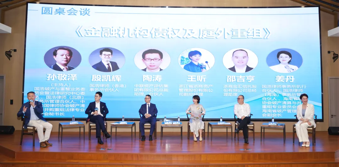 第二場圓桌會談由全國律協破產清算與并購重組法律專業委員會秘書長、國浩破產與重整業務委員會委員、國浩北京管理合伙人孫敬澤主持。浙江省浙商資產管理股份有限公司副總經理王昕介紹了AMC機構參與庭外重組、金融債權保護等方面的平臺優勢,希望未來能加強浙商資產與相關方的合作,以不同身份參與到庭外重組;浙商金匯信托股份有限公司總經理助理邵吉亨指出信托工具在庭外重組方面具有重要價值,市場化重組信托的構建可在風險隔離、債權分配順序的確認等方面發揮價值;中聯資產評估集團有限公司總裁助理、合伙人陶濤介紹了資產評估在庭外重組中的應用和特點,以及其在核心資產價值挖掘、金融機構債權人利益保障、協助重組方案制定等方面起到的重要作用;國浩執行合伙人、國浩海南管理合伙人姜丹以律師視角探討了金融機構債權的保護路徑,她建議充分考慮權益性的償債方案為全體債權人爭取更合理的清償安排;國浩香港合伙人殷凱輝對普通法體系下境外資產、境外抵押擔保等問題進行深入探討,并為破產管理人如何使我國發生效力的破產判決得到域外法院的執行提出了可行建議。