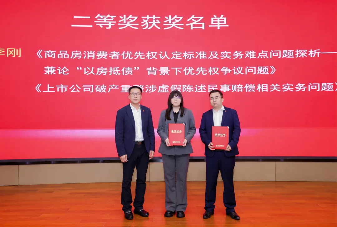 谷景生律師與國浩石家莊合伙人李剛的《商品房消費者優先權認定標準及實務難點問題探析——兼論“以房抵債”背景下優先權爭議問題》、國浩石家莊律師宋瑩的《上市公司破產重整涉虛假陳述民事賠償相關實務問題》榮獲二等獎,由國浩執行合伙人、國浩長沙管理合伙人、主任羅崢為其頒獎。