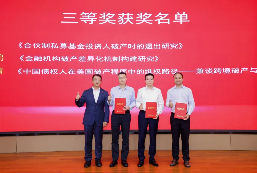 葉通明律師的《合伙制私募基金投資人破產時的退出研究》、國浩北京律師唐鵬與國浩南寧實習律師肖雅婷的《金融機構破產差異化機制構建研究》、國浩北京合伙人李長皓等的《中國債權人在美國破產程序中的維權路徑——兼談跨境破產與執行難題》榮獲三等獎,由國浩執行合伙人、國浩烏魯木齊管理合伙人、主任溫曉軍為其頒獎。
