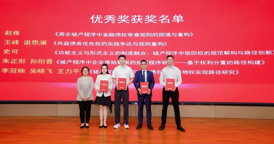國浩石家莊律師趙雅的《房企破產程序中金融債權審查規則的困境與重構》、國浩南京合伙人王峰與國浩南京律師助理諶思瀾的《共益債務優先權的實踐爭議與規則重構》、國浩南京合伙人史可的《功能主義與形式主義的制度融合:破產程序中取回權的規范解構與路徑創新》、國浩蘇州合伙人朱正形、國浩蘇州律師孫珩晉《破產程序中企業原始數據的處置程序研究——基于權利分置的路徑構建》、國浩天津合伙人李冠楠與國浩天津律師吳曉飛等的《破產程序視閾下金融債權人擔保物權實現路徑研究》榮獲優秀獎,由法律出版社資深策劃編輯慕雪丹為其頒獎。
