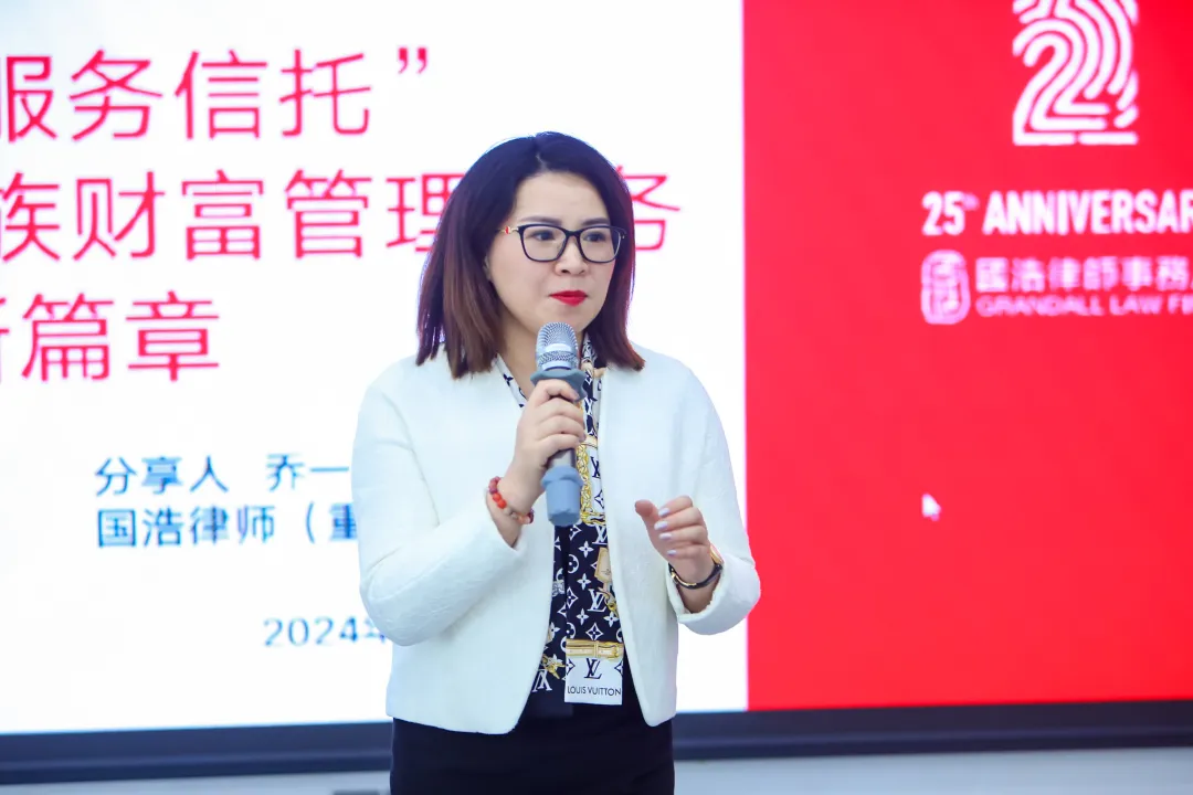 國浩家族財富管理業務委員會副主任、國浩重慶合伙人喬一清圍繞民事服務信托開啟家族財富管理新篇章,分享了民事服務信托在家族財富管理中的應用和優勢。喬一清律師的發言為家族財富管理提供了新的視角,展示了民事服務信托在提供專業服務、優化家族財富結構中的關鍵作用。