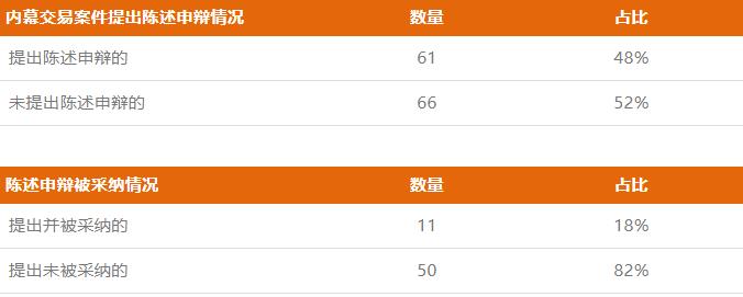 2020年內幕交易行政處罰案件中,近一半案件的當事人提出陳述申辯,提出申辯的案件中有73%為傳遞型內幕交易。在提出陳述申辯的案件中,申辯意見得到采納的占比近五分之一。如前文所述,內幕交易認定過程繁復,尤其是傳遞型內幕交易案件認定時多采用推定規則,而適用推定規則的前提,是證監部門已就聯絡接觸、交易行為和內幕信息“基本吻合”或“高度吻合”等進行充分舉證。然而,交易行為的異常性判斷缺乏客觀或量化的評價標準,且“基本吻合”“高度吻合”又極為抽象,因此,交易異常性一般都是當事人申辯的重中之重。此外,內幕信息、內幕信息敏感期、買入理由的合理性等也是陳述申辯中較為常見的爭議點。