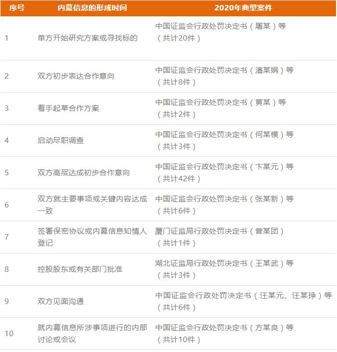盡管《內幕交易司法解釋》給出了內幕信息敏感期的判斷標準,但由于商業實踐復雜多變,內幕信息敏感期的認定既有章可循又無一定之規。以2020年涉及并購重組的內幕交易行政處罰案件為例,內幕信息形成時間大致劃分如下: