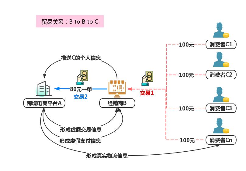 跨境電商經營者在線下發展大量的經銷商,通過其擁有的龐大客戶開拓市場。在該情形中,實際消費者C通過經銷商B的網店、微商下單購買所謂的海淘、代購產品并支付費用后,經銷商B扣除差價后將采購需求發送給跨境電商平臺A,跨境電商平臺A虛構三單信息向海關申報,并通過跨境電商零售進口模式進口。