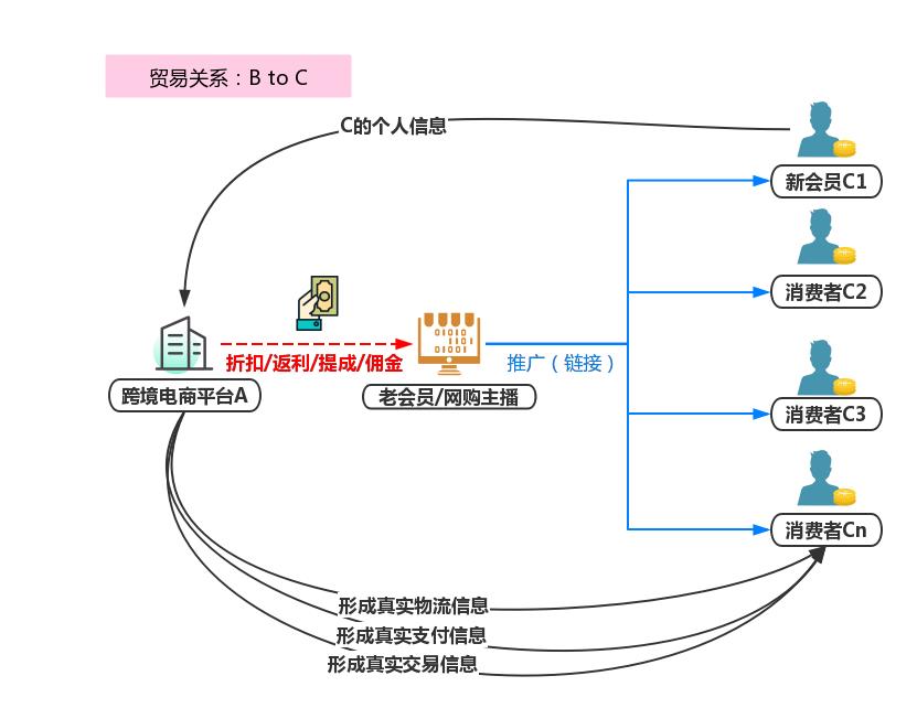 跨境電商平臺A為了拓寬銷售渠道,鼓勵會員發展新會員,通過社交媒體推廣商品鏈接,會員會因為發展會員和推廣而產生的購買行為獲得一定的折扣或報酬。