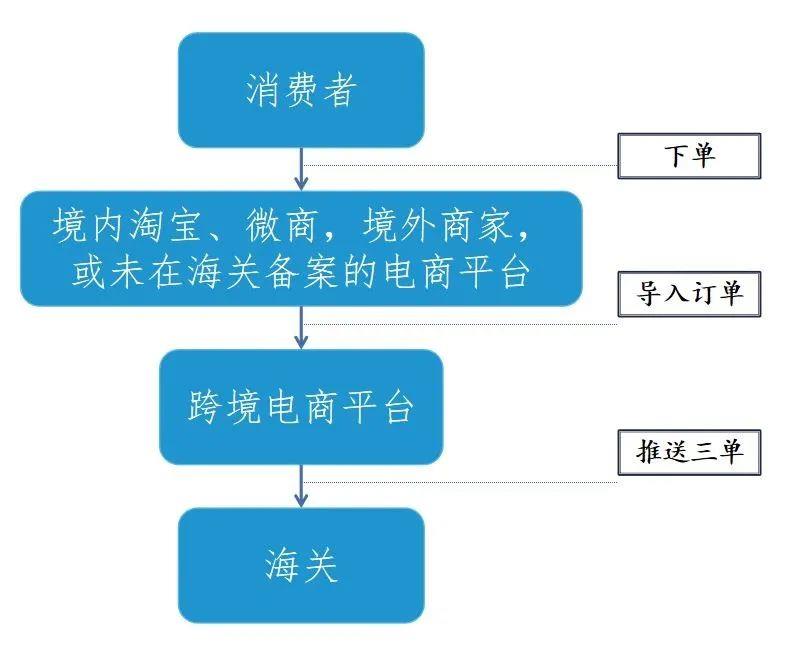 “推單”系跨境電商經營者與境外商家,或境內淘寶、微商等店鋪,或其他未在海關備案的電商平臺合作,將消費者的真實訂單導入與海關聯網的跨境電商平臺,根據導入的真實訂單匹配支付單和物流單,并將“三單”信息推送給海關,最終以跨境電商零售進口模式將境外商品申報入境并直接寄送至下單的消費者。具體流程如下圖所示: