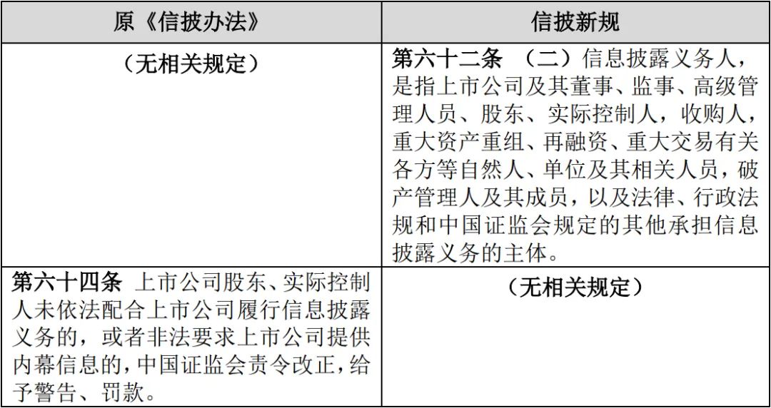 信披新規(guī)新增了關(guān)于信息披露義務(wù)人具體范疇的規(guī)定,第62條明確了信披義務(wù)人不僅包括上市公司及其董監(jiān)高,還包括上市公司股東、實(shí)控人,收購人,重大資產(chǎn)重組、再融資、重大交易有關(guān)各方等主體,以及破產(chǎn)管理人及其成員等主體。原《證券法》第63條雖然著重強(qiáng)調(diào)了發(fā)行人和上市公司的信披義務(wù),但同時(shí)也弱化了上市公司股東及交易對(duì)手方等主體的信披責(zé)任,新《證券法》第78條在信披義務(wù)人范圍的界定上,突破了以發(fā)行人和上市公司為第一責(zé)任人的規(guī)制邏輯,確立了以“信息披露義務(wù)人”為規(guī)制對(duì)象的監(jiān)管原則,信披新規(guī)第62條則在新《證券法》第78條原則性規(guī)定的基礎(chǔ)上作了進(jìn)一步細(xì)化。