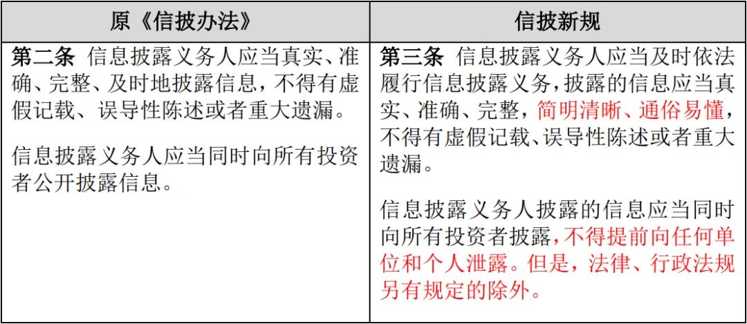 信披新規(guī)第3條完善了信息披露的基本原則:一是完善了信息披露公平原則,保障信息披露對(duì)所有投資者一視同仁;二是新增了“簡明清晰、通俗易懂”之要求,增強(qiáng)公告內(nèi)容的可讀性和易懂性。
