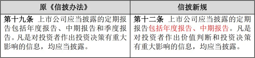 信披新規(guī)第12條調(diào)整了需要披露的定期報(bào)告的范圍,刪除了原《信披辦法》里有關(guān)季度報(bào)告的相關(guān)規(guī)定,明確了定期報(bào)告包括僅包括年度報(bào)告和中期報(bào)告。但需注意,季度報(bào)告的披露由交易所在其業(yè)務(wù)規(guī)則中明確,上交所、深交所相關(guān)規(guī)則中均對(duì)季度報(bào)告的披露作出了詳細(xì)規(guī)定,現(xiàn)行披露制度對(duì)投資者知情權(quán)的保護(hù)力度并未降低。