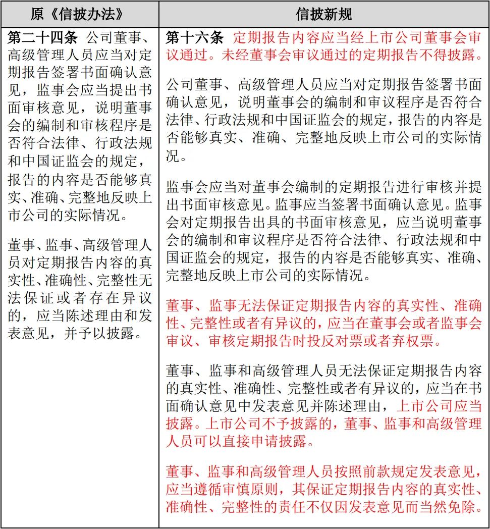 信披新規(guī)第16條完善了董監(jiān)高異議聲明制度。第一,明確了未經(jīng)董事會(huì)審議通過的定期報(bào)告不得披露。第二,董事、監(jiān)事無法保證定期報(bào)告內(nèi)容的真實(shí)性、準(zhǔn)確性、完整性或者有異議的,應(yīng)當(dāng)在董事會(huì)或者監(jiān)事會(huì)審議定期報(bào)告時(shí)投反對(duì)票或棄權(quán)票。第三,董監(jiān)高無法保證定期報(bào)告內(nèi)容的真實(shí)性、準(zhǔn)確性、完整性或者有異議的,應(yīng)當(dāng)在書面確認(rèn)意見中發(fā)表意見并陳述理由,發(fā)表意見應(yīng)遵循審慎原則。