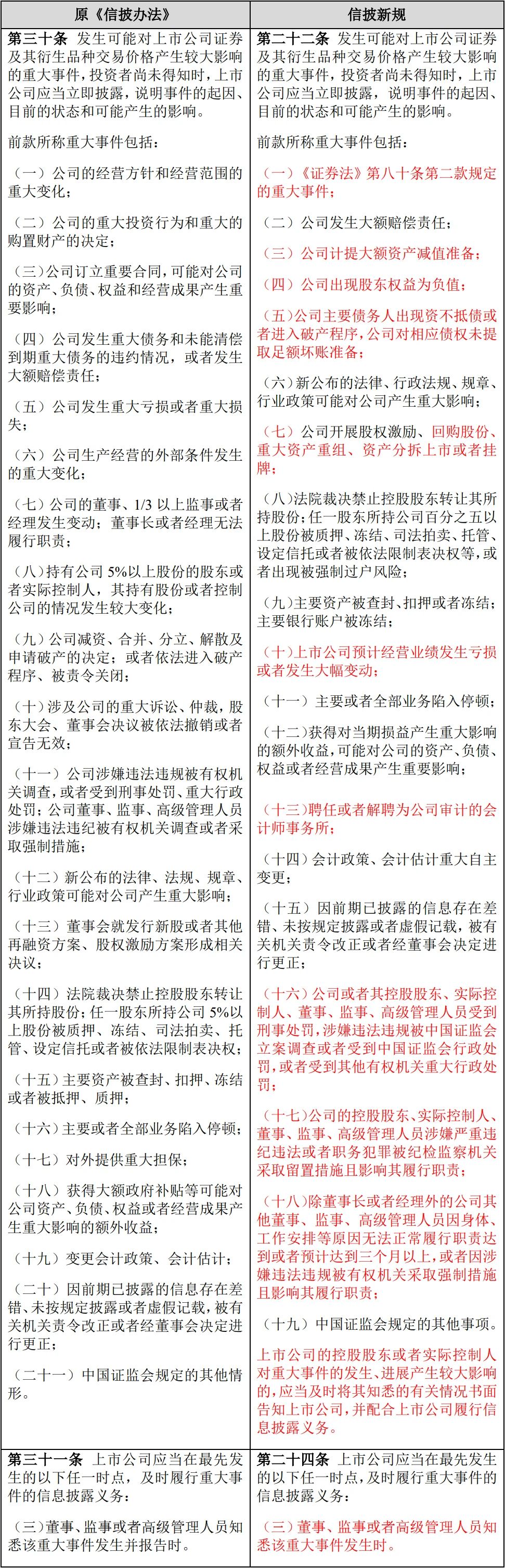 此外,信披新規(guī)修改了上市公司重大事件披露時(shí)點(diǎn)。相較于原《信披辦法》第31條將董監(jiān)高“知悉該重大事件發(fā)生并報(bào)告時(shí)”作為披露時(shí)點(diǎn),信披新規(guī)第24條規(guī)定當(dāng)董監(jiān)高“知悉該重大事件發(fā)生時(shí)”,上市公司即觸發(fā)披露義務(wù)。通過對(duì)比可發(fā)現(xiàn),上市公司臨時(shí)報(bào)告的時(shí)點(diǎn)進(jìn)一步提前,信息披露的及時(shí)性進(jìn)一步增強(qiáng)。