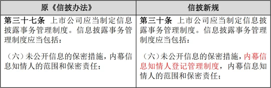 信披新規(guī)第30條進(jìn)一步完善了上市公司信息披露事務(wù)管理制度,新增“內(nèi)幕信息知情人登記管理制度”。在近期證監(jiān)會(huì)、證監(jiān)局及滬深交易所的監(jiān)管案例中,頻繁出現(xiàn)相關(guān)主體因內(nèi)幕信息知情人登記管理不規(guī)范而被采取行政監(jiān)管措施或自律監(jiān)管措施的情形,建議上市公司參考今年2月生效的《關(guān)于上市公司內(nèi)幕信息知情人登記管理制度的規(guī)定》及時(shí)更新、完善相關(guān)制度。