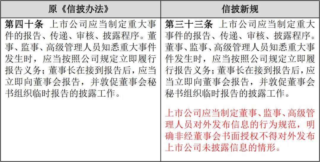 信披新規(guī)第33條新增了對(duì)于董監(jiān)高對(duì)外發(fā)布信息行為的規(guī)制,規(guī)定上市公司應(yīng)當(dāng)制定董監(jiān)高對(duì)外發(fā)布信息的行為規(guī)范,明確非經(jīng)董事會(huì)書面授權(quán)不得對(duì)外發(fā)布未披露信息的情形。近年來,常見上市公司高管動(dòng)輒發(fā)布有關(guān)業(yè)績目標(biāo)的“豪言壯語”或者泄漏尚未公開的重要信息,信披新規(guī)針對(duì)該等現(xiàn)象進(jìn)行了專門規(guī)制,填補(bǔ)了規(guī)則空白。上市公司高管往往既是公司領(lǐng)航者,又是行業(yè)專家,在公共場(chǎng)合發(fā)表自身看法無可厚非,但是由于其身份特殊性,需結(jié)合發(fā)布信息的時(shí)間、地點(diǎn)、內(nèi)容等,謹(jǐn)慎為之,不可過于隨性。