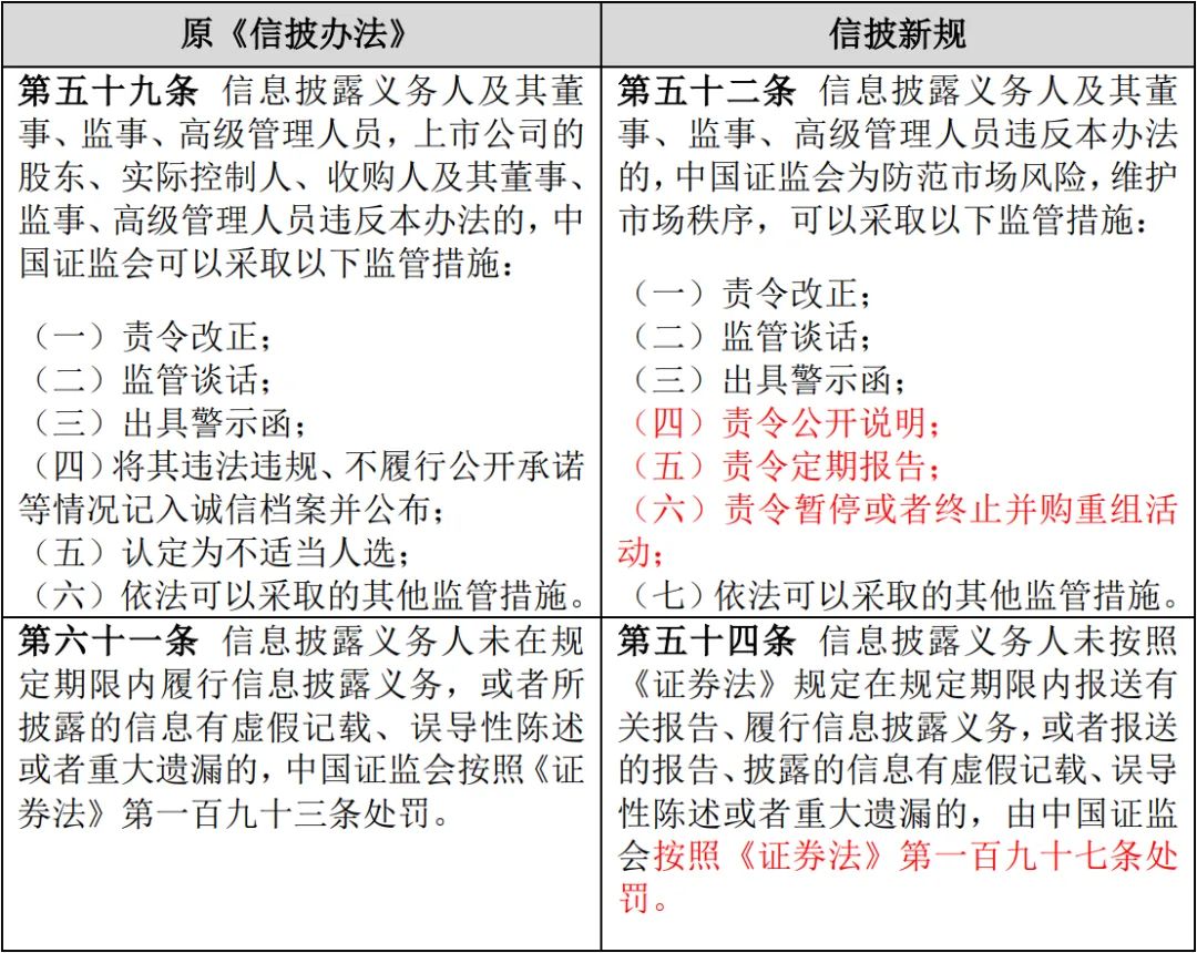 關(guān)于監(jiān)管措施類型,信披新規(guī)第52條保留了原《信披辦法》中的責(zé)令改正、監(jiān)管談話、出具警示函三類措施,新增了責(zé)令公開說明、責(zé)令定期報(bào)告、責(zé)令暫停或者終止并購重組活動(dòng)三類措施,并刪除了記入誠信檔案的監(jiān)管措施。關(guān)于處罰依據(jù),信披新規(guī)第54條將信披違規(guī)的處罰依據(jù)由原《證券法》第193條更新為新《證券法》第197條,即信披違規(guī)罰款金額由原來的60萬元頂格處罰上升至1000萬元。