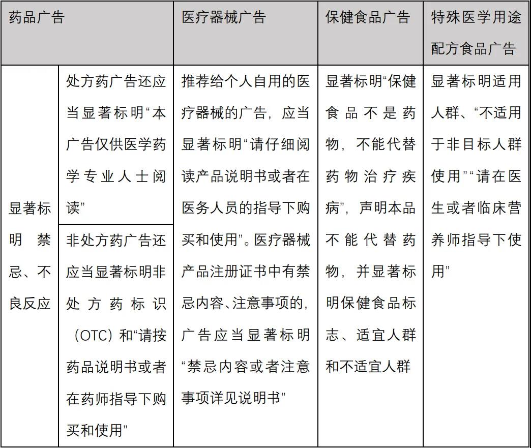 根據(jù)《暫行辦法》第五、第六、第七、第八條之規(guī)定,除了“三品一械”廣告內(nèi)容所宣稱的功效、適宜人群等內(nèi)容均不得超出產(chǎn)品備案或注冊的產(chǎn)品說明書的范圍以外,針對“三品一械”中的不同類型產(chǎn)品,其廣告畫面中應(yīng)清晰顯著地標明相應(yīng)的內(nèi)容,如下表所示[注10]: