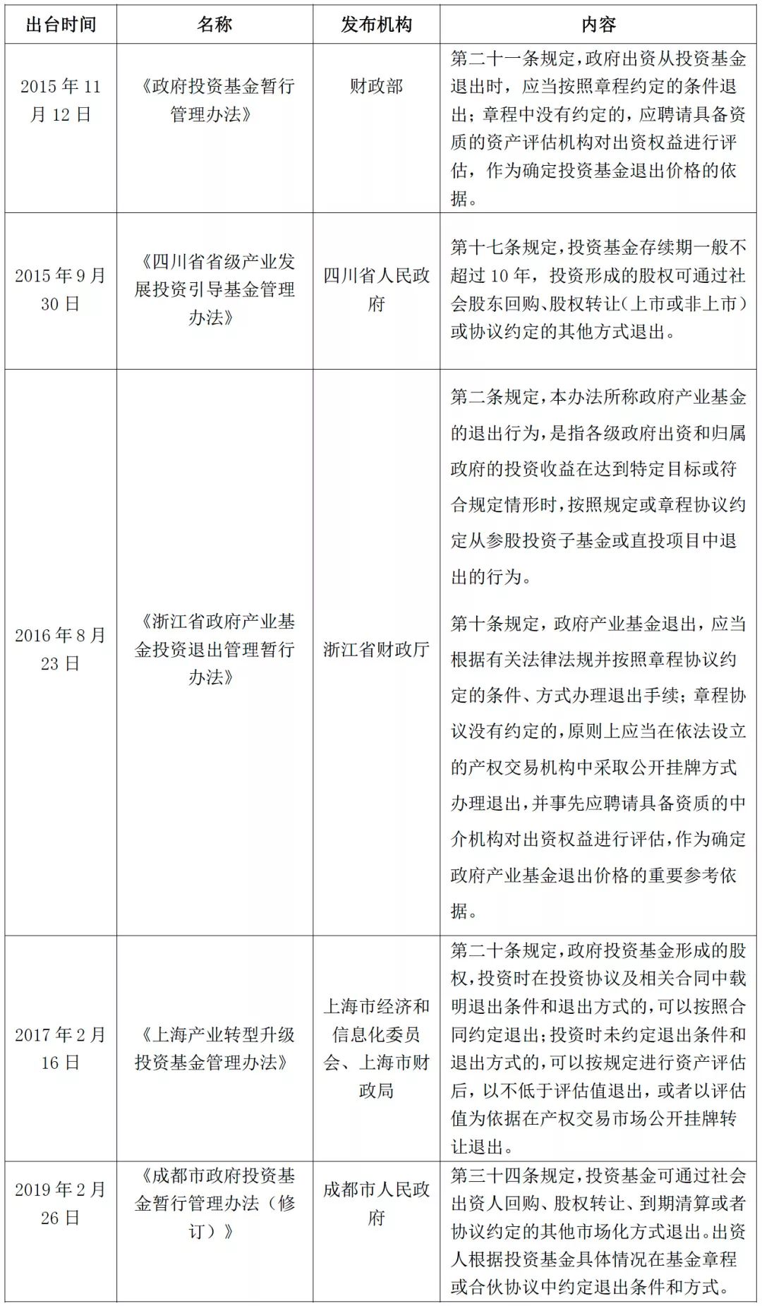 如前所述,32號令第六十六條對政府投資基金投資形成企業產(股)權對外轉讓進行了例外性規定,指出可以“按照有關法律法規規定執行”。而梳理相關的法律法規,就筆者查閱到的法律、行政法規及地方性法規層面,并未發現有特殊性規定,在部門規章、地方政府規章及規范性法律文件層面的部分相關規定如下: