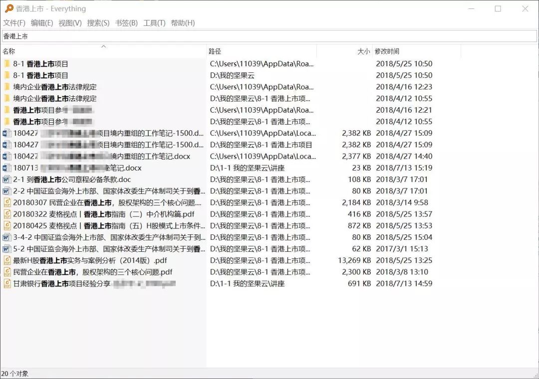 例如,筆者想搜索電腦中關(guān)于“香港上市”的相關(guān)資料,在輸入“香港上市”的即刻,所有相關(guān)資料均顯示出來,一共20個目標(biāo)對象,選取所需文件點(diǎn)開即可。