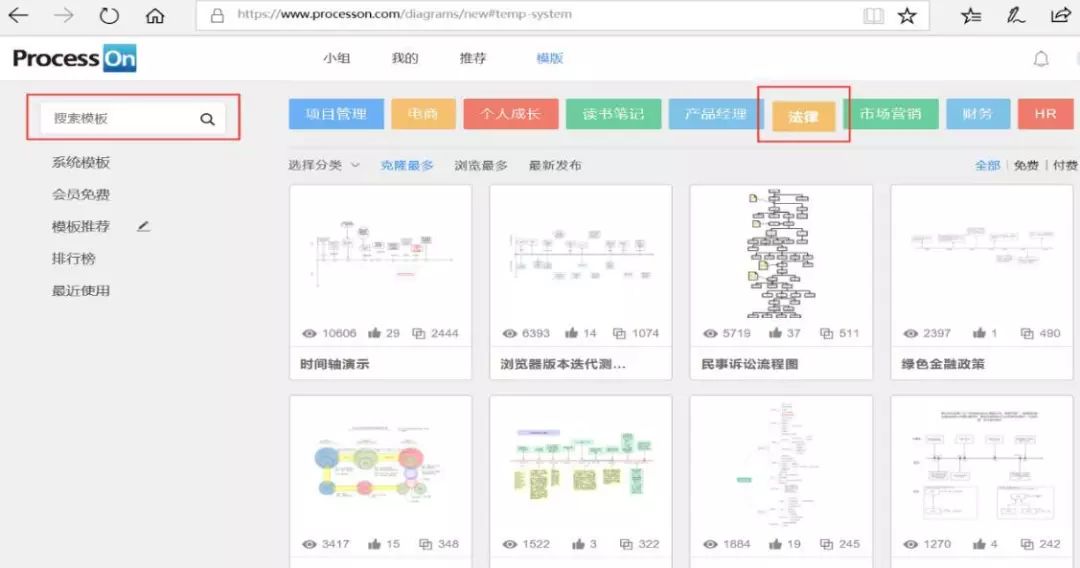 ProcessOn的使用非常簡單,用戶只需通過注冊便可獲得這一永久免費(fèi)的服務(wù)。ProcessOn中有多種模板可以參考選擇,用戶可以在“法律”板塊選擇相應(yīng)的模板,或者在“搜索模板”中尋找所需模板,通過模板進(jìn)行進(jìn)一步繪制。