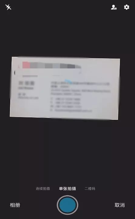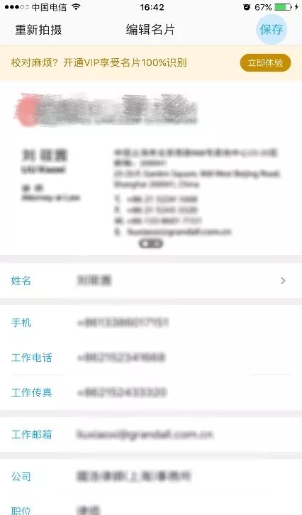 由于名片一般為白底,因此在拍照掃描的過程中,應(yīng)盡量避免用白底拍攝名片,以免影響識別速度,一般來說,名片全能王能直接框出名片范圍,并自動生成所有信息,精準(zhǔn)度基本可以達(dá)到100%。以下為筆者任意掃描一張名片所框出的名片范圍及輸出信息: