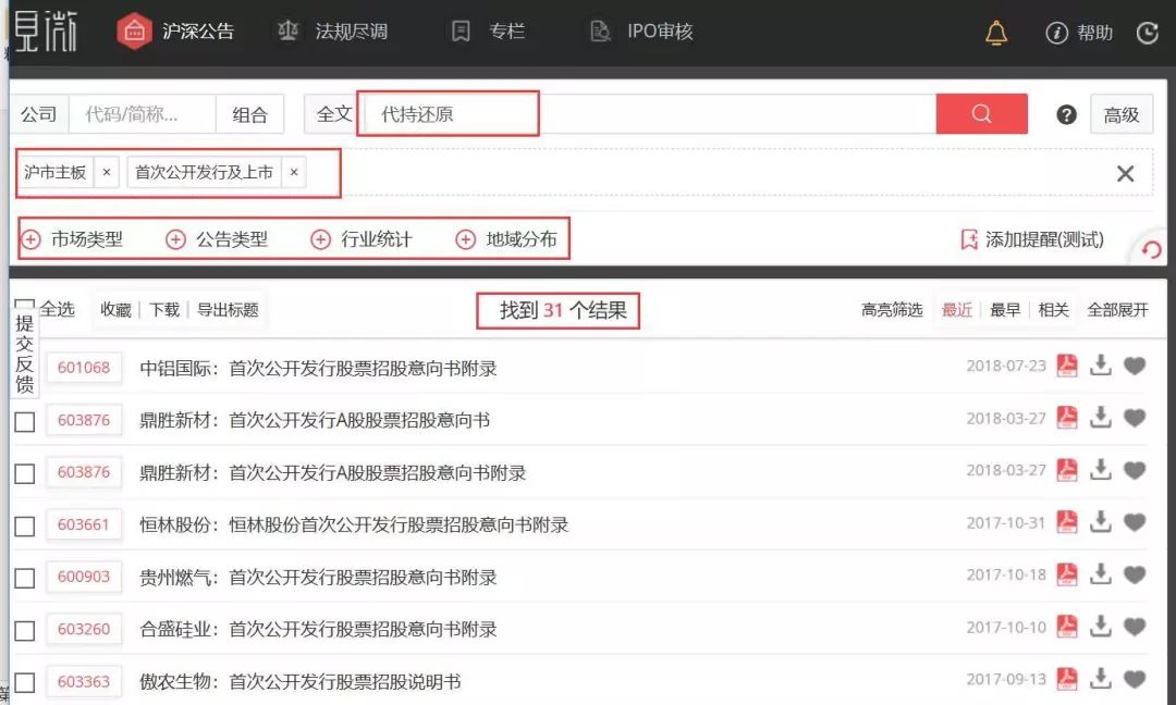 見微數(shù)據(jù)公告則完全免費(fèi),用戶可以根據(jù)公司代碼、全文關(guān)鍵詞、市場類型、公告類型、行業(yè)統(tǒng)計、地域分布等進(jìn)行搜索,例如筆者想尋找“滬市首次公開發(fā)行并上市的公司中存在代持還原”的案例,即可進(jìn)行如下搜索,共尋找到31個結(jié)果,具體如下: