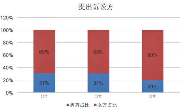 從上圖可看出,女方提出離婚的比例遠高出男方,且出現逐年遞增的趨勢。這說明近年來,隨著社會發展,女性的經濟能力及社會地位均有提升,對待婚姻中的矛盾與委屈,更多女性不愿逆來順受,而敢于主動選擇結束不幸福的婚姻,掌握追求幸福的主動權。同時,這也反映出社會輿論對離婚展現出更加包容、客觀的態度,大眾法律意識的上升,也讓“離婚婦女”不再是一個略帶貶義的標簽,當代女性對于婚姻的定義也悄然發生變化。