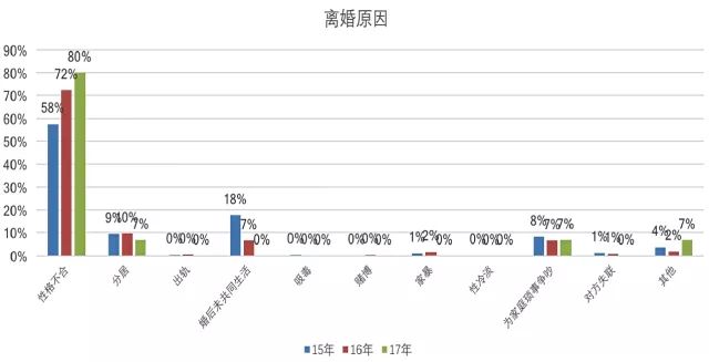排除上文所說的“假結婚”類離婚案件,以上圖表顯示“性格不合”是離婚糾紛中最常見的原因,其后“分居”、“為家庭瑣事爭吵”也成為摧毀婚姻的元兇,而“出軌”、“家暴”、“吸毒”、“賭博”等在常人眼里比較有殺傷力的離婚事由則占比不大。究其原因,一方面,因為法院對“出軌”、“家暴”、“吸毒”、“賭博”等事實認定的證據要求較為嚴苛,因此,原告雖以這些事由提出離婚,但無法提供有效證據證明對方的過錯,最終法院未予認定;另一方面,也顯示了在婚姻生活中林林總總的小矛盾累積起來對夫妻感情的破壞力也是很強的。當然,當愛已不在,離婚其實不需要理由,只需要借口,因此在判決書中,我們發現甚至有原告以“被告經常因跳廣場舞不回家……”、“被告聽聞2012年為世界末日,從此離家出走,至今未歸……”等為由起訴離婚的奇葩案件。本團隊律師希望大家在婚姻生活中彼此多一些理解,多一些包容,更要多一些關愛,少一些爭吵,切勿因小失大,賠上得之不易的感情。