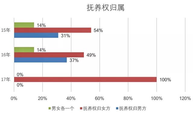 從上表可見,在涉及撫養權的離婚案件中,離婚時子女的撫養權多判歸女方。法院在確定撫養權歸屬時,一般會從有利于子女健康成長的原則出發,綜合考慮男、女方的收入、職業、學歷、是否有不良習性等客觀撫養條件,在法律規定的范圍內作出撫養權歸屬的判決。照顧孩子付出較多,孩子在情感上比較依賴的一方相對而言比較容易得到孩子的撫養權。如果孩子的年齡超過8周歲,法院還需要征求孩子的意見來決定由哪一方直接撫養孩子。