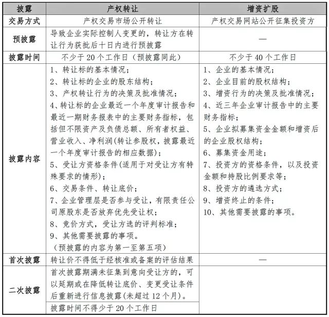 (3) 方法:轉(zhuǎn)讓方應(yīng)當(dāng)在轉(zhuǎn)讓行為獲批后10個工作日內(nèi),通過產(chǎn)權(quán)交易機構(gòu)進行信息預(yù)披露,時間不得少于20個工作日。