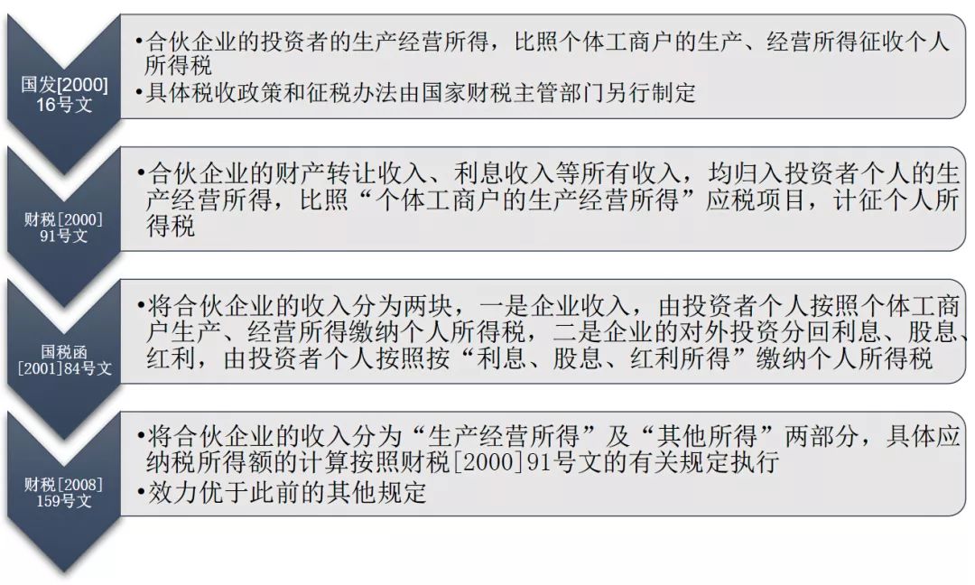 《國務院關于個人獨資企業和合伙企業征收所得稅問題的通知》(國發〔2000〕16號):自2000年1月1日起,對個人獨資企業和合伙企業停止征收企業所得稅,其投資者的生產經營所得,比照個體工商戶的生產、經營所得征收個人所得稅。具體稅收政策和征稅辦法由國家財稅主管部門另行制定。