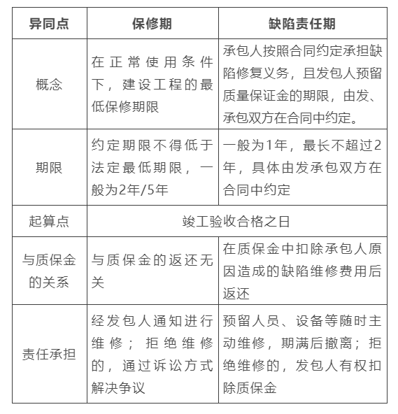 其中,保修期和缺陷責任期的區別較大,具體如下表所示: