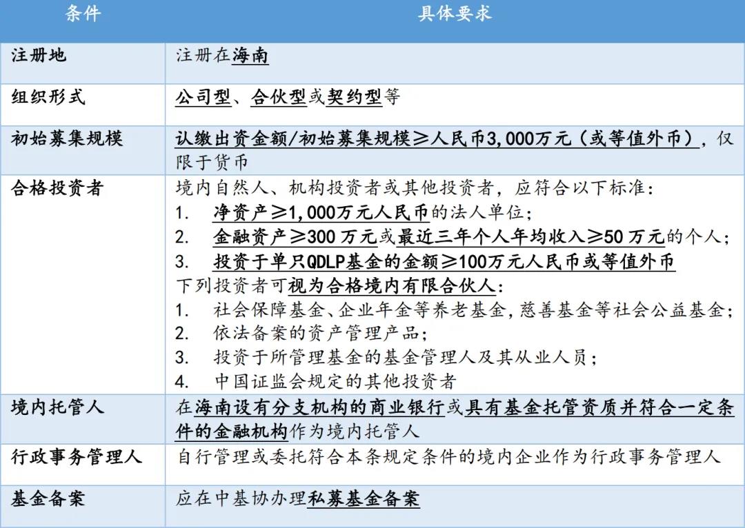 《海南QDLP辦法》對QDLP基金及其合格境內投資者設置了具體的資質條件如下: