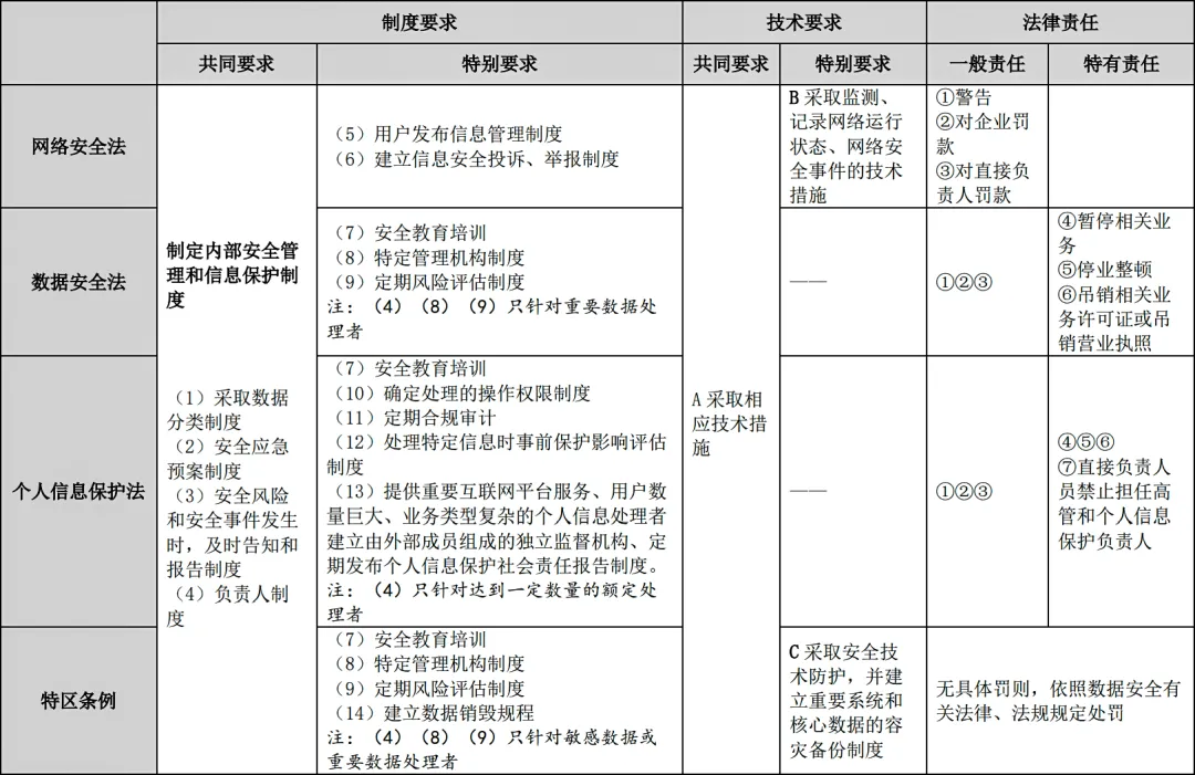 對以上四部法律的制度和技術要求進行簡化,共性匯總和特性分離后,我們整理出以下簡表:
