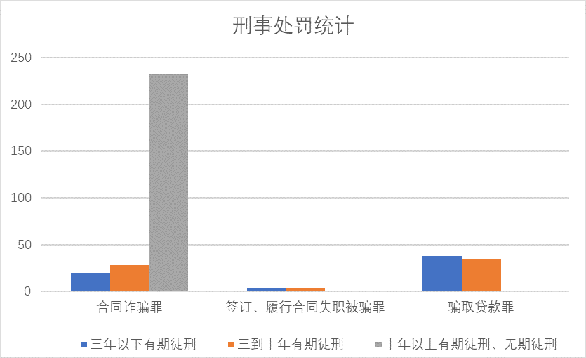 在所判處的刑罰中,以合同詐騙罪定罪處罰的案例中共有204例個人被判處十年以上有期徒刑,其中28例個人被判處無期徒刑。單位受處罰中,除了情節較輕的之外,大部分的企業都被處以200萬元以上的罰金。因基礎刑罰較重,故雖然有其他的量刑情節,如認罪認罰、退賠損失、諒解等,也很難適用緩刑和降低罰金數額。以簽訂、履行合同失職被騙罪定罪處罰的案例中,共有4例被判處三年以下有期徒刑,其余4例被判處三年以上有期徒刑。量刑情節中,以如實供述、積極退賠為主,僅2例適用了緩刑。以騙取貸款罪定罪處罰的案例中,自然人共有35例被判處三年以上有期徒刑,38例被判處三年以下有期徒刑。企業被判處刑罰,除少數被判處10萬、20萬罰金外,多數被判處50萬以上罰金,最多的犯罪主體被判處500萬罰金。